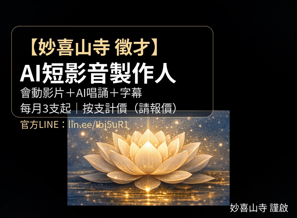 【妙喜山寺 徵才】AI短影音製作|按支計價| 妙喜山寺